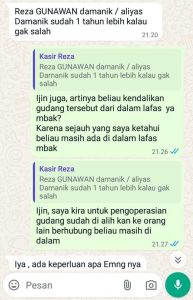 “Saya kurang tahu siapa pengelola gudang, Bang, tetapi jika abang mau, saya kenal dan punya nomor kontak kasirnya,” sembari memberikan nomor kontak kasir gudang tersebut.