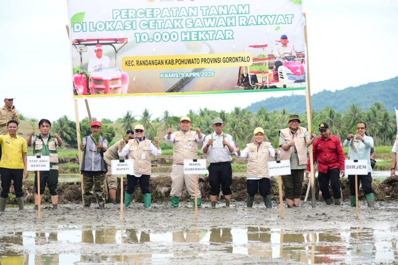 Pohuwato, INTAINEWS.ID – Wakil Gubernur Gorontalo Idah Syahidah Rusli Habibie terjun langsung ke sawah mengikuti gerakan tanam serempak di lokasi cetak sawah rakyat (CSR) seluas 10.000 hektare di Desa Motolohu Selatan, Kecamatan Randangan, Kabupaten Pohuwato, Kamis (9/4/2026).