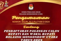 BOLMUT | (KPU) Kabupaten Bolaang Mongondow Utara (Bolmut) telah resmi mengumumkan pembukaan pendaftaran bagi pasangan calon Bupati dan Wakil Bupati untuk Pilkada tahun 2024….